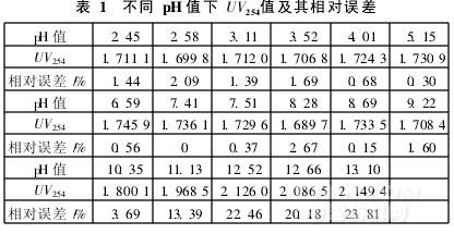 將同一水樣等分成若干份,分別用硫酸或氫氧化鈉調節pH值,然后測定其UV254值(見表1)。表1中,pH值為2.45~9.22,UV254變化不大; pH>10時,UV254顯著增大。這主要是由于pH值不同,有機物的顯色基團會發生變化。因此,不同廢水的UV254隨pH值的變化規律是不一樣的。以pH值為7.41時的UV254為基準,計算各pH值下UV254的相對誤差,結果見表1。