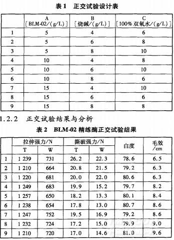 以燒堿、精練酶BLM-02和雙氧水用量為三因素,設(shè)計(jì)L9(3。)正交試驗(yàn),見(jiàn)表l。