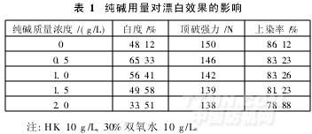 由于腈綸基牛奶蛋白纖維織物不耐堿,在較高的堿劑濃度下易變黃,而H2O2/HK體系需要在一定堿性條件下才能發揮出漂白效果,因此,堿劑用量是H2O2/HK漂白的一個重要的工藝因素。試驗選用純堿作為堿劑,分別為在0,0.5,1.0,1.5,2.0g/L的用量下進行漂白,結果如表1所示。