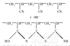 當純堿用量在0.5g/L時,白度達到最高。再提高純堿用量,能產生漂白有效組分的量增加,但是白度卻呈下降趨勢,這是因為牛奶蛋白纖維中聚丙烯腈在堿性條件下會發生水解,相鄰的丙烯腈結構單元之間發生環化反應,形成含CN鍵的共軛結構。這種共軛結構能夠吸收可見光而使織物泛黃[5],反應如下所示[4]: