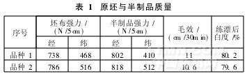采用冷軋堆練漂工藝,基本解決了彈力斜紋織物加工中易卷邊、折皺的缺點,半制品降強少,白度、毛效符合后道染色工序要求(表1)。