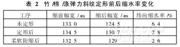 定形工序可去除化纖混紡織物的布面折皺,改善起毛起球現(xiàn)象。對氨綸包芯彈力織物而言,定形可消除纖維內(nèi)應(yīng)力,改變纖維的超分子結(jié)構(gòu)和卷曲狀態(tài),使彈力織物的幅寬趨于一致,表面平整,紗線密度更為均勻,使彈力織物的緯向縮水率可得到改善。彈力織物預(yù)定形視練漂半制品的落布幅寬而定,即下機幅寬小于或接近成品幅寬,可先定形后絲光;若練漂半制品幅寬超過成品幅寬,原則上先絲光縮幅,使彈力纖維在軋堿拉伸中通過堿液的潤滑作用,使纖維在松弛狀態(tài)下回縮,然后再熱定形。熱定形條件可根據(jù)緯向縮水率、彈力織物本身品質(zhì)、紗支密度和回彈性的要求決定。一般通過大樣定形放樣,測試縮水率,最終確定定形溫度和時間。混紡彈力織物干定形條件為185℃,在熱區(qū)停留35s,經(jīng)測試,可滿足緯向縮水率要求。練漂半制品定形前后的縮水率如表2所示。