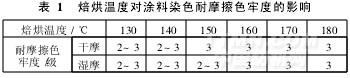 按1.2.1進行涂料染色,黏合劑用量為100g/L,焙烘時間3min,改變焙烘溫度,并按以1.3.1測試染色織物的耐摩擦色牢度,結果見表1。