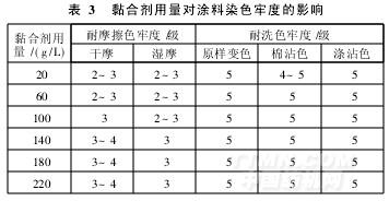 按1.2.1進行涂料染色,焙烘溫度為160℃,焙時間3min,改變黏合劑用量并按1.3.1和1.3.2分測定染色織物的耐摩擦色牢度和耐洗色牢度,結果表3。