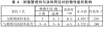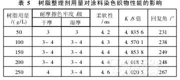 (2)樹脂和涂料進(jìn)行同浴染色,可提高涂料染織物的耐摩擦色牢度,但其柔軟性和K/S值有所下降