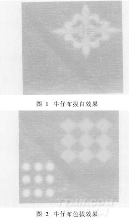 牛仔布拔染印花時,糊料和粘合劑的選擇是拔染印花的關鍵。糊料的耐堿、耐酸、耐電解質性能必須良好,既能用于堿拔,又能用于酸拔,同時成漿后的流變性好,運行及儲存穩定,印制的花型保形性好等。粘合劑對拔染劑JN和檸檬酸應有良好的相容性和穩定性,并具有柔軟而高堅牢度的性能,以滿足牛仔服進行預洗加工的要求。應選用低溫型粘合劑,經蒸化可達到拔染和固著兼顧目的。印制時,色漿的粘度以控制在50~60dPa·s為宜。色漿太稠,不利于滲透;太稀則易滲化,且花型輪廓不清晰,產生毛邊現象。