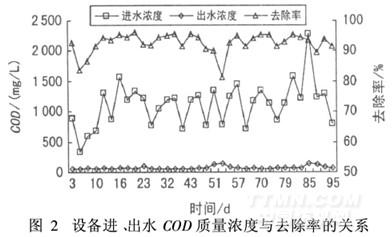 (2)設備連續運行3個月,在日處理量為5m3的情況下,出水能夠滿足設計要求,在最佳運行條件下出水COD能基本保持在80mg/L以下,COD去除率為95%左右。
