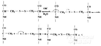 因此,堿性拆鍵液pH值不能大于10.5。這是由于強堿作用于羊毛胱氨酸二硫鍵,產生雙分子消除反應,生成了脫氧苯基丙酸殘基和半胱氨殘基及硫,使二硫鍵產生不可逆斷裂,造成毛纖維損傷,這對拉伸羊毛是不可取的。其反應式如下[1]: