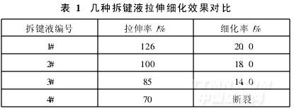 由表1可見,1#拆鍵液拉伸細化效果最好;2#拆鍵液能滿足一般工業拉伸要求;3#拆鍵液比傳統的只含拉開粉、JFC的拆鍵液的效果好。