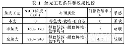 絲光加工不僅可以提高織物的尺寸穩定性,還可以提高染色、印花的得色量和均勻性。竹炭粘膠/棉織物是提花組織,經緯向均有棉纖維,如果不進行絲光織物經緯向棉紗的染色性能會受影響,可能會造成布面光澤差、得色不鮮艷等。但是,竹炭纖維中的粘膠基質耐堿性差,故對本光、半絲光和全絲光三種工藝進行