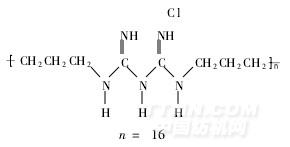在高分子聚合物中直接引入抗菌基團而得的高分子類抗菌劑可以克服上述缺點,其性能穩定,不揮發,使用壽命長,易于儲存,加工方便,不會滲入人或動物表皮。如BASF的Reputex(聚六亞甲基雙胍)就是一種胍鹽型的陽離子高分子類抗菌劑,其分子結構為: