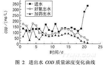 從圖2中進水COD質(zhì)量濃度變化曲線可以看出,進水COD質(zhì)量濃度在100~340mg/L之間波動;A段HRT(水力停留時間)8h,O段HRT4h。中試1~5天為調(diào)試階段,調(diào)試過程部分接種污泥流失,導致出水COD質(zhì)量濃度升高。調(diào)試結(jié)束后,出水COD濃度逐漸降低并最終穩(wěn)定在90mg/L以下,平均COD去除率31%左右。為了不增加處理出水的電導率,以保證處理出水經(jīng)深度處理可回用于生產(chǎn)工藝,本研究采用陽離子型有機高分子脫色劑對A/O段出水進行混凝沉淀處理,藥劑投加量為陽離子脫色劑30mg/L、聚丙烯酰胺(PAM)1mg/L,平均出水COD質(zhì)量濃度55mg/L,COD去除率在36%左右。從COD處理效果可以看出:A/O段對COD去除效率較低,這是由于中試進水為已經(jīng)過生化處理的二沉池出水,水中殘留污物大多為難降解物質(zhì),故中試生化段對COD處理效率較低。經(jīng)A/O/混凝沉淀后,出水的COD質(zhì)量濃度小于60mg/L。試驗結(jié)果表明,采用該工藝對染色廢水二級處理出水具有較好的COD去除效果。