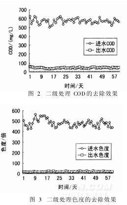 將印染生產的工業廢水分類排入污水處理廠。其中,輕污染廢水直接排入,重污染廢水回收部分可利用物料,再經物化初步處理后排入。污水二級處理工藝采用(厭氧)水解酸化→好氧生物接觸氧化→投藥氣浮處理工藝,其處理流程見圖1。二級處理工藝對COD和色度的去除效果見圖2和圖3。