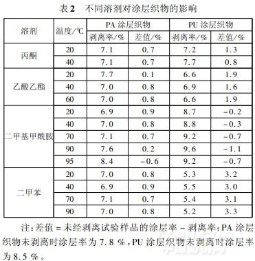表2中,PA涂層織物分別經丙酮、乙酸乙酯、二甲基甲酰胺、二甲苯處理,其涂層率與剝離率差值的絕對值均<1%,說明剝離得均較全面。但PU涂層織物分別經丙酮、乙酸乙酯、二甲基甲酰胺、二甲苯處理,其剝離率差異較大。
