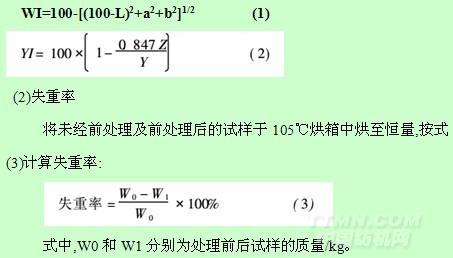 試樣的三刺激值(XYZ),Lab值(Hunter表色體系)和彩度C在Color-Eye7000A測色儀上測定,采用D65光源和10°觀察角。亨特白度(WI)按式(1)計算,黃度(YI)按ASTME313-73計算[式(2)]: