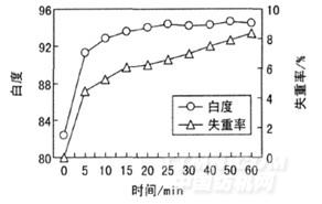 白速率較快,這說明其含有的漂白組分在高溫下具有迅速分解的特點。隨著處理時間的延長,織物的失重率逐漸增大,說明織物上的漿料被逐漸去除。綜合考慮,處理時間以40min為宜。
