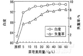 改變改性茶皂素用量,按1.2.1節工藝于98℃對棉織物浸漬處理40min,測試處理后織物的白度和失重率,結果見圖4。