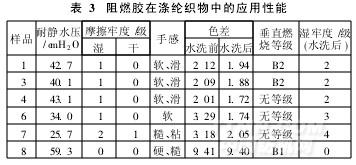 在阻燃涂層膠中,加有交聯劑封閉性聚氨酯,其在焙烘過程中會釋放出—NCO,與活性氫發生交聯反應,提高涂層膠交聯度、涂層牢度和耐水性(表3)。