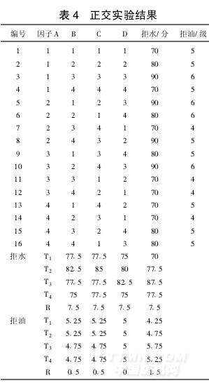 A2B2C3D3,等離子處理時間為3min、壓強40Pa、功率100W、焙烘溫度140℃、時間為5min。用最佳工藝進行實驗其拒水等級為100分,拒油等級為6級,經10次水洗后其拒水等級為90分,拒油等級為6級。對等離子處理工藝進行探討,發(fā)現各個因素對拒水拒油耐洗性影響都差不多,說明工藝條件比較容易控制,比較容易投入實際生產。