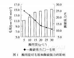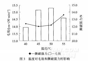 由圖4可知,隨著處理時(shí)問(wèn)的延長(zhǎng),織物毛效不斷增加,手感得到改善,撕破強(qiáng)力下降.但時(shí)問(wèn)過(guò)長(zhǎng),會(huì)嚴(yán)重?fù)p傷織物,影響服用性能.綜合考慮,處理時(shí)間以6Omin為宜.