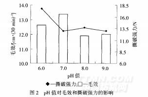 工作液pH值會(huì)影響精練酶與底物的結(jié)合,只有在特定的pH值條件下,酶促反應(yīng)速度才能達(dá)到最大值.溶液pH值高于或低于最適pH時(shí)都會(huì)使酶的活性降低甚至變性失活.由圖2可知,在pH=7.0時(shí),各性能較好.說(shuō)明KDN—T02在中性條件時(shí)的活性及除雜效果較好,對(duì)纖維的損傷較小.對(duì)機(jī)織物毛效為主要考察指標(biāo),N確定KDN—T02酶堆的最佳pH=7.0,此時(shí)強(qiáng)力滿足要求.