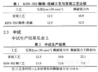 通過(guò)小樣試驗(yàn)優(yōu)化出KDN—T02酶堆一低堿精練配方:KDN—T02 15g/L,pH=7.0,50℃,60min,NaOH 15L由表1可知,使用KDN—T02進(jìn)行低堿前處理,其毛效、強(qiáng)力均能達(dá)到常規(guī)工藝指標(biāo).