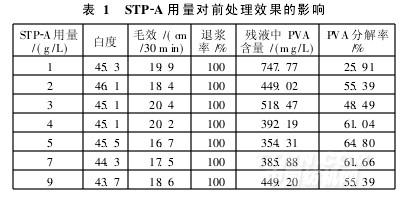 由表1可知,STP-A用量在1~4g/L,織物白度、毛效及PVA分解率均不斷提高;當STP-A用量大于4g/L后,織物上PVA分解率,白度和毛效有變差趨勢。因此,后續試驗取STP-A用量為4g/L。