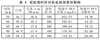 由表3可知,延長前處理時間,織物白度略有增加,PVA漿料的分解率隨前處理時間延長而升高,當前處理時間達120min時,其分解率達到最大。考慮處理效率和成本,確定前處理時間為90min。