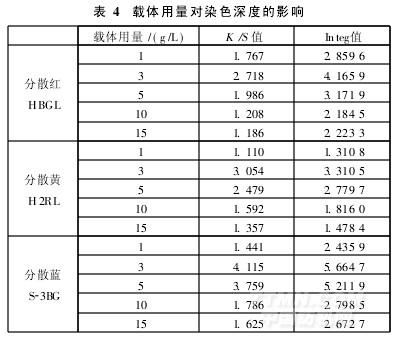 由表4可知,載體用量增加,三種染料的K/S值先增加后降低。STZT-1用量為3g/L時,K/S值達到最大值。因此,確定載體用量為3g/L。
