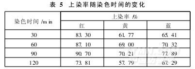 由表5可知,隨染色時間的延長,三種分散染料的上染率均增加。染色90min時,三種分散染料的上染率均達到最大值。染色120min,三種分散染料的上染率反而下降。因此,確定染色時間為90min。
