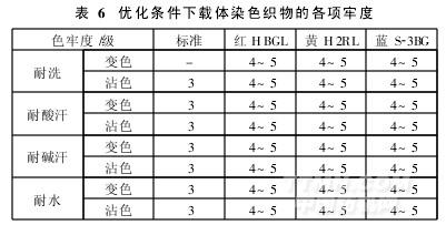 綜上,優化的載體染色工藝為:載體用量為3g/L,染料用量為2%(owf),高溫勻染劑TF-2031g/L,pH值4.5~5,浴比1∶30,染色溫度120~130℃,染色時間90min。該工藝下的染色牢度見表6。