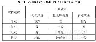 試驗了在平紋、斜紋、緞紋及提花織物上的印花效果,如表11所示。