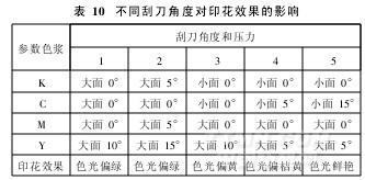 刮刀的角度和壓力不同,刮印到織物上的色漿量不同,導致四個色疊印后色光偏差較大。對于不同的花型和色調,可通過調整刮刀的度和壓力來控制給漿量,以確保印花顏色準確性。試驗中發現,壓力太大,不但會使印出來的網點模糊成色塊,而且會使刮刀彎曲變形(造成刮刀與花版和織物呈面接觸),影響印制質量;壓力太小,則有一些細部的網點印不出來,這兩種情況都會導致圖像損失細部,影響色彩層次。