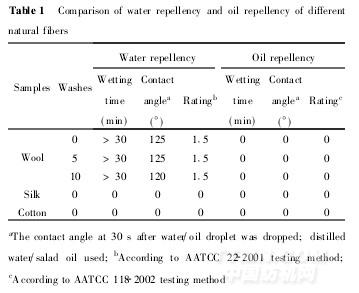 由表1知,雖然羊毛、蠶絲和棉均屬親水性纖維,但羊毛纖維呈現天然固有的良好的拒水性能,這歸因于羊毛纖維特殊的表面結構.羊毛纖維表面覆蓋著鱗片層,每一鱗片角皮細胞又由最外表皮層(epicuticle)、外角質層(exocuticle)和內角質層(endocuticle)組成[3,4].羊毛的最外表皮層富含以C21為主的共價鍵合的類脂物質(lipids)[5],賦予了羊毛表面天然的疏水性.然而,羊毛表面的拒油性則不佳,色拉油滴在羊毛織物上瞬間就鋪展潤濕,按AATCC118-2002方法測定的拒油級為零級.顯然,這歸因于羊毛表面類脂層的表面能低于水的表面張力(73mN/m),但不足以低于油的表面張力(20~35mN/m)[6].因而,對于高檔羊毛制品,有必要進行拒水拒油整理,以賦予其優越的抗拒水性和油性液體沾污的能力(stainresistance),提高羊毛制品的品位和附加值.