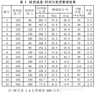 焙烘工藝的主要目的是,加速初縮體與纖維素反應,生成穩定的共價交聯鍵[2]。表1為焙烘溫度、時間對免燙整理效果的影響。