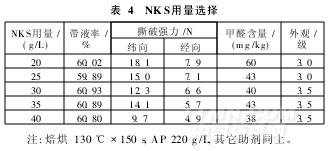 由表3可知,不同催化劑對亞麻織物外觀的影響較小[3]。從強力損傷和甲醛含量來看,NKS的催化效能較好。以下試驗選用NKS作為催化劑。