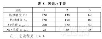 以影響亞麻織物免燙整理效果的焙烘溫度、焙烘時間、樹脂AP濃度、催化劑NKS濃度為4因素,各因素取三水平,見表5。