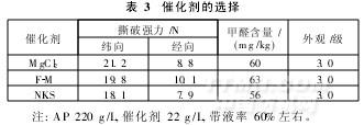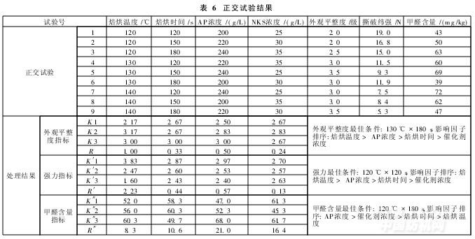根據以上正交試驗的方差分析,以外觀平整度為評測指標時,較佳工藝為A2B3C3D2;以強力為評測指標時,較佳工藝為A1B1C1D1;以甲醛含量為評測指標時,較佳工藝為A1B3C1D2。綜合考慮三個指標,選擇工藝條件為:A2B2C2D2,即焙烘溫度130℃,焙烘時間150s,樹脂AP濃度220g/L,催化劑NKS濃度30g/L。