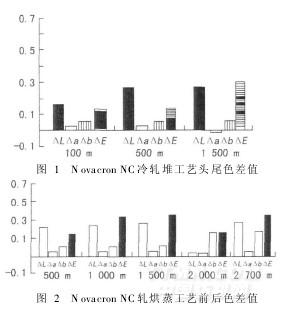 (2)圖2為軋烘蒸染色工藝連續運轉中色相的變化,顯示在500、1000、1500、2000、2700m與10m作為標準色相的對比:ΔL、Δa、Δb、ΔE均小于0.5,也說明頭尾無反差。
