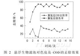 印染廢水的生物脫色主要是在兼氧或厭氧條件下進行[9~12],本研究分析了懸浮生物濾池在兼氧條件下對模擬印染廢水色度及COD的去除效果。在染料濃度50mg/L和其它營養物、微量元素含量不變的條件下,考察了活性艷紫染料廢水的色度及COD變化情況,結果如圖2所示。