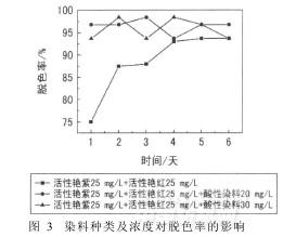 保持其它組分不變,增加進水中染料的種類及濃度。圖3給出了三種不同染料廢水的脫色率曲線。