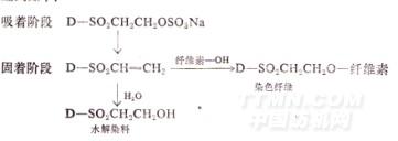 這類染料的化學特性是能在染色過程中產生活潑雙鍵的乙烯砜基,而商品染料的化學結構大都是β-羧乙基砜硫酸酯,因為在中性介質范圍中(PH6-8),β-羧乙基砜硫酸酯具有較好的水溶性和化學穩定性。已吸著在纖維上的染料,在強堿的作用下,生成乙烯砜基(—SO2CH—CH2),通過加成反應,與纖維素羧基發生醚鍵結合。染色過程中的反應式如下: