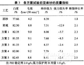 從表3得知,(1)經強力保護劑處理后的紗線強力高于草酸預處理后的紗線;方案5經強力保護劑H預處理后又在堿氧工作液中添加強力保護劑H處理的紗線強力最好;(2)無論哪個方案煮漂后紗線斷裂伸長率明顯高于原紗斷裂伸長率,但預處理后再經煮漂后的紗斷裂伸長率更高.原因是:預處理后,去掉了不溶性無機鹽和重金屬離子,煮漂效果更好,纖維間雜質去除更勻透,降低了纖維間的作用力、纖維的可移動岳仕芳,等:亞麻筒子紗堿氧一浴練漂工藝探討37性增大,應力集中現象得到了改善,纖維的韌性增強,這對后續染色、倒筒及織造工序的生產非常有利;(3)因白度、毛效無論哪個方案都能滿足后道工序質量要求,結合強力、斷裂伸長率及成本考慮,方案1較為合適,即不經預處理直接在堿氧工藝中添加強力保護劑H.
