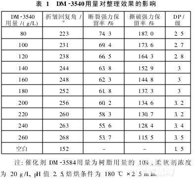 表1數據表明,DM-3540用量大于140g/L可以獲得較好的防皺效果,且在DP達到3.2級的情況下,斷裂強力保留率仍能保持60%以上,撕破強力保留率在135%左右。