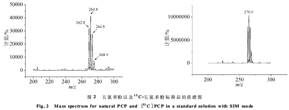 將五氯苯酚(0.5μg/g)標準溶液流動注射進質譜儀,為保證被測離子具有較好的靈敏度和穩定性,對質譜條件進行了優化。在諸多參數中,不同毛細管電壓、干燥溫度、干燥氣流速、錐孔電壓和裂解能量對測定產生影響。采用未標記五氯苯酚m/z 264.8(M-)和同位素標記五氯苯酚m/z 270.9(M-)在質譜上的峰面積比進行定量。定量離子稱為m/z264.8和270.9,在實驗條件下,其豐度大,檢測干擾小。以下為五氯苯酚標準品和五氯苯酚標記物的質譜圖。