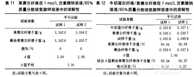 根據牛奶蛋白纖維在各種試劑中的溶解性,經反復試驗,筆者用1mol/L。次氯酸鈉溶液/65%質量分數硫氫酸鉀溶液測定牛奶蛋白纖維/萊賽爾纖維中各組分含量。萊賽爾纖維在lmol/L。次氯酸鈉溶液/65%質量分數硫氫酸鉀溶液中的溶解情況如表ll所示。