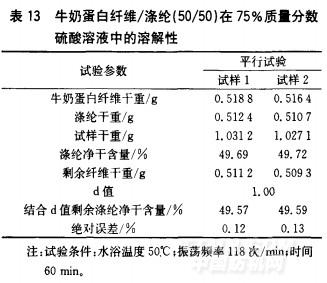 牛奶蛋白纖維在50℃的75%質量分數的硫酸溶液中能完全溶解,75%質量分數的硫酸溶液對滌綸幾乎沒有損傷,修正系數為1.00[5]。筆者做了牛奶蛋白纖維和滌綸纖維混合物的測試。結果表明,可以用國家標準-列中滌綸和棉、粘膠纖維的方法來分析牛奶蛋白纖維的含量。牛奶蛋白纖維、滌綸在硫酸溶液中的溶解性如表13。