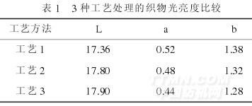 取上述3種工藝處理的織物放在datacolor測色配色儀器下進行測試,比較其光亮度,結果如表1。