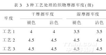 參照GB/T3920-1997,將處理好的滌綸織物試樣進(jìn)行測(cè)試,用灰色樣卡評(píng)定摩擦位置的摩擦褪色級(jí)數(shù),用沾色用灰色樣卡評(píng)定摩擦布的沾色級(jí)數(shù),結(jié)果見表3。