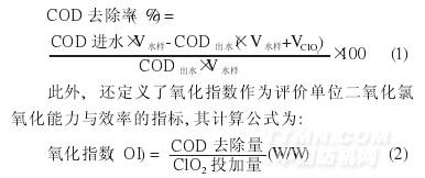 針對難降解廢水及本實驗廢水濃度高、可生化性差等特點,二氧化氯催化氧化技術將首先著眼于污染物濃度的削減,本文中采用COD去除率作為評價氧化處理效果的主要指標。考慮氧化劑帶入的體積,計算公式如下: